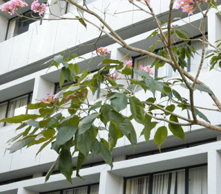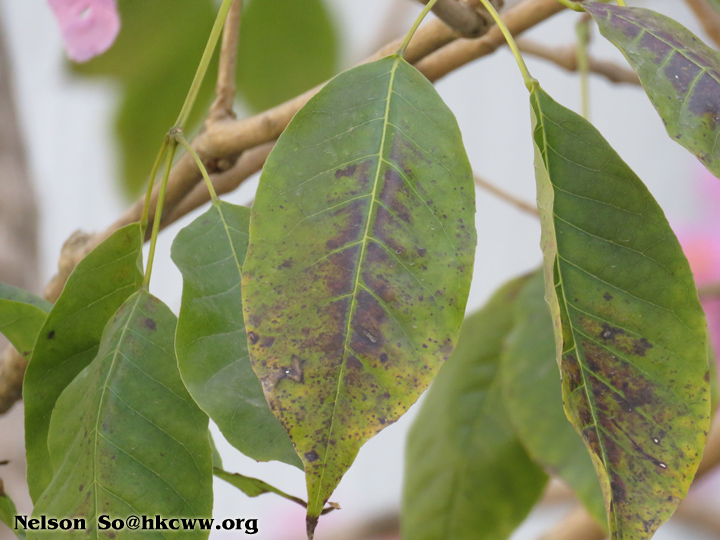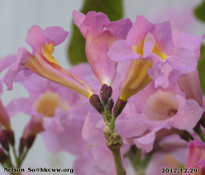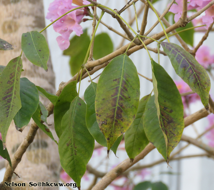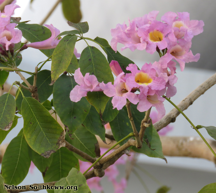 | 備註: 歐陽卓立出的第三本書: 花萼長筒狀--H.heptaphyllus 花萼鐘狀-H.impetiginosus 中文名參考blog.xuite.net 以成長好的喬木來説,唔計幼株, H.heptaphyllus: 小葉6.5-9.8cm 長,2.7-4.7cm闊。葉緣有規則齒。 H.impetiginosus: 小葉9.5-14.2cm 長,4.5-8.3cm 濶。小葉葉緣由全緣 或近葉尖1/2-1/3 的地方有不規則齒。 thanks Crawford's info and reference link: www.scielo.org.ar 總體來說,H.impetiginosus的葉比 H.heptaphyllus 大好多. Handroanthus impetiginosus: 葉緣近全緣 特徵是葉子手掌般大,側脈凹下。(thanks Igu Ana Lee's info) Source from Mercury Wong's facebook: Handroanthus impetiginosus 中文名定為(藥用風鈴木/藥用漢氏木) 詳細地說,H. impetiginosus 的頂生小葉柄長度明顯短於頂生小葉的寬度,基生小葉柄短於近基生小葉柄的一半長度; H. heptaphyllus 則是頂生小葉柄長度與頂生小葉寬度近等,基生小葉柄長於近基生小葉柄的一半長度。 The Plant List: Handroanthus impetiginosus (Mart. ex DC.) Mattos is an accepted name Tabebuia impetiginosa (Mart. ex DC.) Standl. (Synonym) photo taked at CUHK on 14 Jan Reference: Mercury Wong's facebook 紅色系的花的"風鈴木"(其實有兩個屬Tabebuia和Handroanthus,不過香港唔分),第一件事係看葉全緣還是有齒。全緣就簡單多了。 thanks Crawford Law's info | |