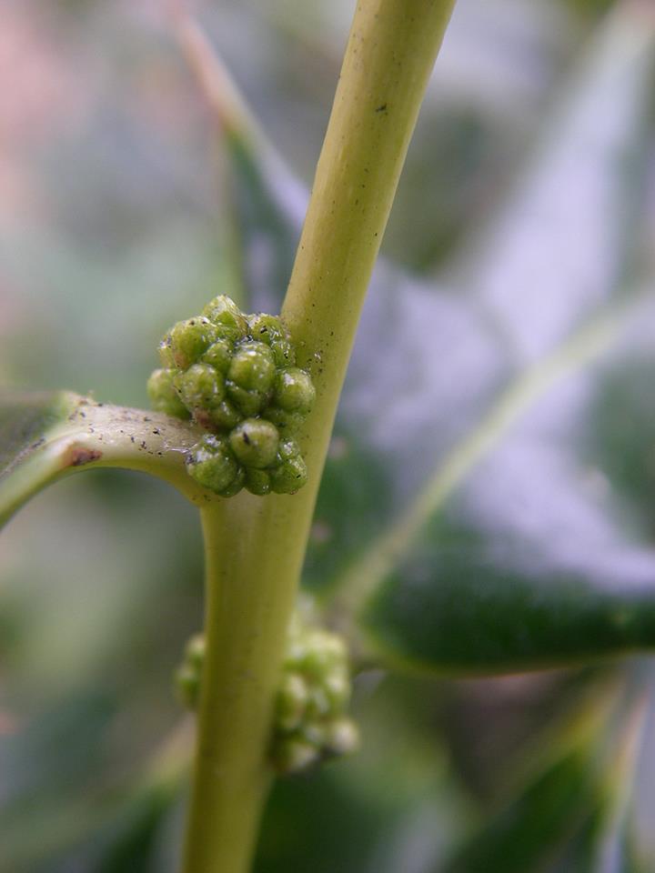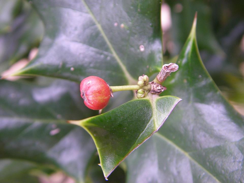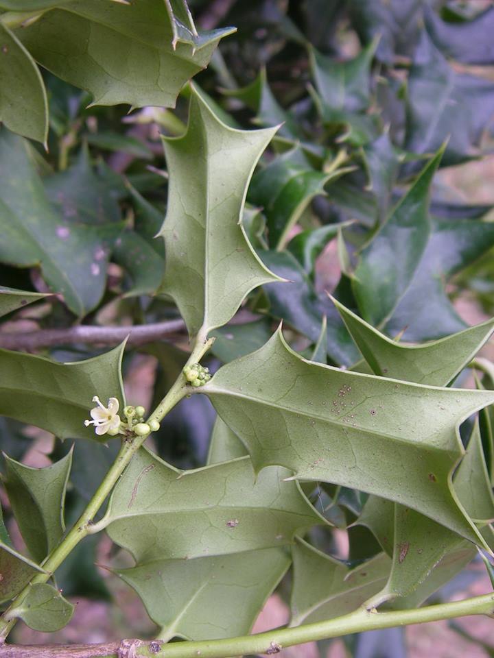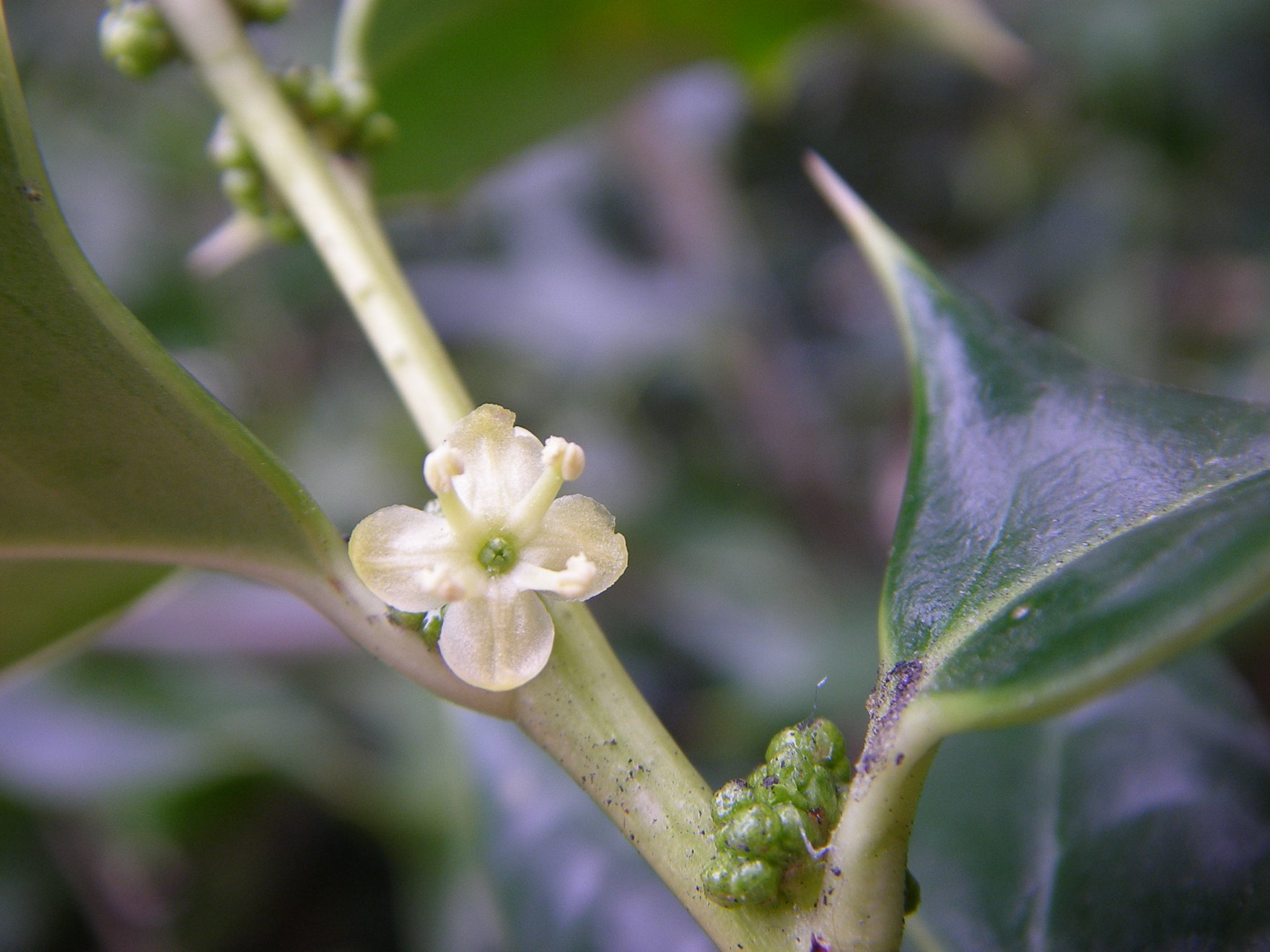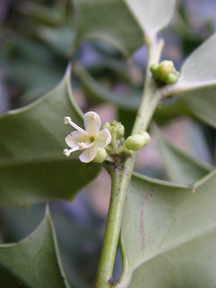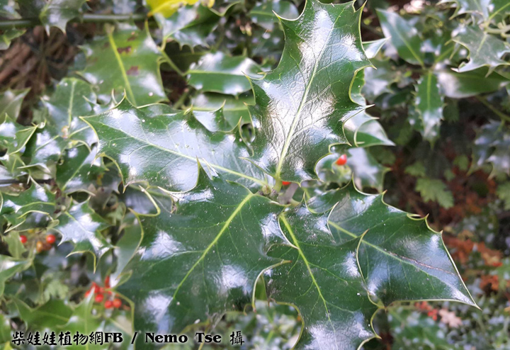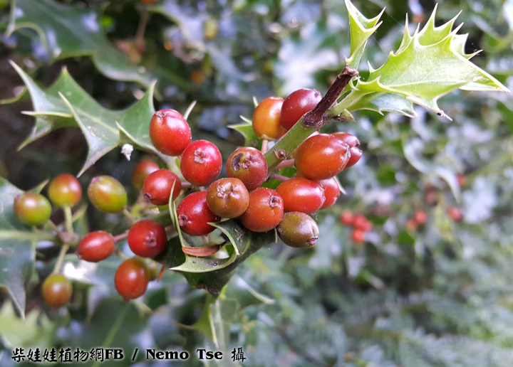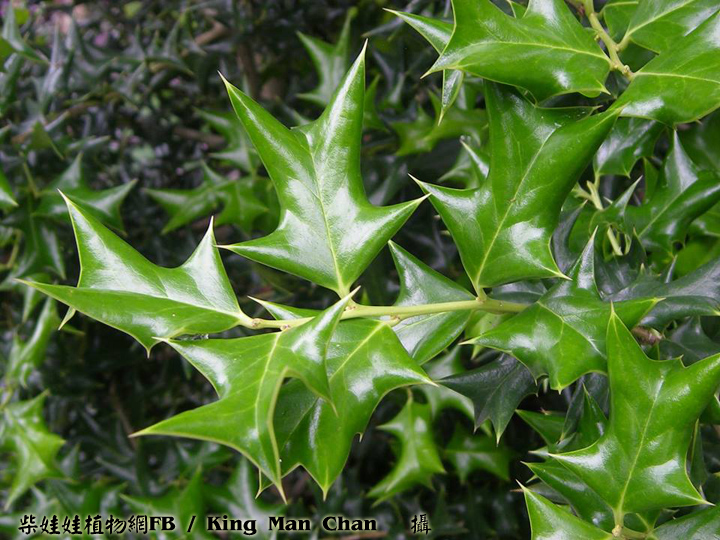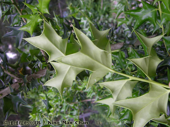 | 備註: Fruit taken from United Kingdom FoHK Evergreen shrub or small tree, 1–3 m high; branchlets stout, subterete, minutely puberulent or glabrescent. Leaves thick-leathery; petioles 4–8 mm, puberulent; leaf blade quadrangular-oblong, rarely ovate, 5–6 × 2.5–3 cm, base rounded or sub-truncate; apex acute or shortly acuminate, always with 3 spines; margin entire or sinuate, with 1–3 spines on each side, dark green and shining adaxially, paler abaxially. Inflorescences fasciculate, sessile, axillary, on second year’s growth, branches of the fascicles uniflowered; flowers 4-merous. Staminate pedicels 5–6 mm long; calyx patelliform, 2.5 mm across, sparsely puberulent, ciliate; corolla rotate, 7 mm across, petals connate at base; stamens subequaling the petals, anthers ovoid-oblong; rudimentary ovary subglobose. Pistillate pedicels 8 – 9 mm long, after fruiting 13– 14 mm long; calyx patelliform, lobes obtuse, ciliate; corolla rotate, 7 mm across, petals sparsely ciliate; staminodes short; ovary oblong-ovoid, stigma discoid. Fruit globose 8–10 mm in diam., stigma discoid. Pyrenes 4, 7–8 × 5 mm, wrinkled-pitted, rugose all over. 中國植物誌 常綠灌木或小喬木,高(0.6-)1-3米;幼枝具縱脊及溝,溝內被微柔毛或變無毛,二年枝褐色,三年生枝灰白色,具縱裂縫及隆起的葉痕,無皮孔。葉片厚革質,二型,四角狀長圓形或卵形,長4-9厘米,寬2-4厘米,先端具3枚尖硬刺齒,中央刺齒常反曲,基部圓形或近截形,兩側各具1-2刺齒,有時全緣(此情況常出現在卵形葉),葉面深綠色,具光澤,背淡綠色,無光澤,兩面無毛,主脈在上面凹下,背面隆起,側脈5或6對,於葉緣附近網結,在葉面不明顯,在背面凸起,網狀脈兩面不明顯;葉柄長4-8毫米,上面具狹溝,被微柔毛;托葉胼胝質,寬三角形。花序簇生於二年生枝的葉腋內,基部宿存鱗片近圓形,被柔毛,具緣毛;苞片卵形,先端鈍或具短尖頭,被短柔毛和緣毛;花淡黃色, 4基數。雄花;花梗長5-6毫米,無毛,基部具1-2枚闊三角形的小苞片;花萼盤狀;直徑約2.5毫米,裂片膜質,闊三角形,長約0.7毫米,寬約1.5毫米,疏被微柔毛,具緣毛;花冠輻狀,直徑約7毫米,花瓣長圓狀卵形,長3-4毫米,反折,基部合生;雄蕊與花瓣近等長或稍長,花藥長圓狀卵形,長約1毫米;退化子房近球形,先端鈍或圓形,不明顯的4裂。雌花:花梗長8-9毫米,果期長達13-14毫米,無毛,基部具2枚小的闊三角形苞片;花萼與花瓣像雄花;退化雄蕊長為花瓣的4/5,略長於子房,敗育花藥卵狀箭頭形;子房長圓狀卵球形,長3-4毫米,直徑2毫米,柱頭盤狀,4淺裂。果球形,直徑8-10毫米,成熟時鮮紅色,基部具四角形宿存花萼,頂端宿存柱頭盤狀,明顯4裂;果梗長8-14毫米。分核4,輪廓倒卵形或橢圓形,長7-8毫米,背部寬約5毫米,遍布皺紋和皺紋狀紋孔,背部中央具1縱溝,內果皮骨質。花期4-5月,果期10-12月。 本種之樹形美麗,果實秋冬紅色,掛於枝頭,與歐洲之聖誕樹Ilex aquifolium L. 可以媲美並代替供庭園觀賞。 | |