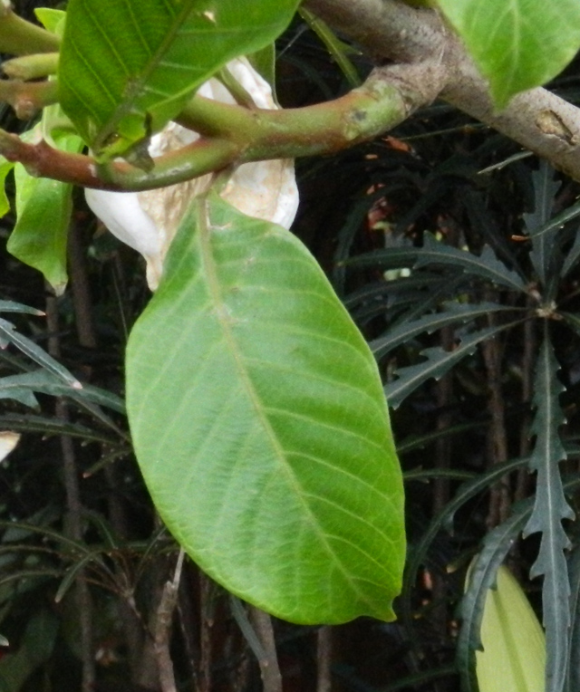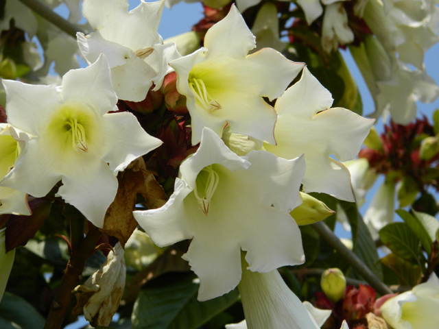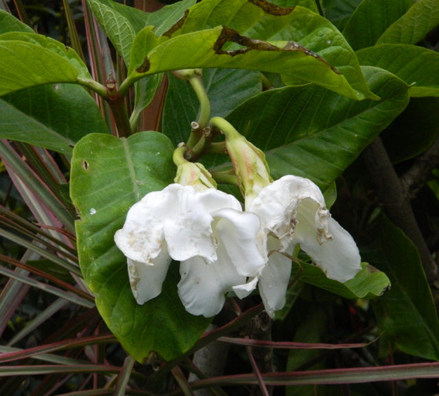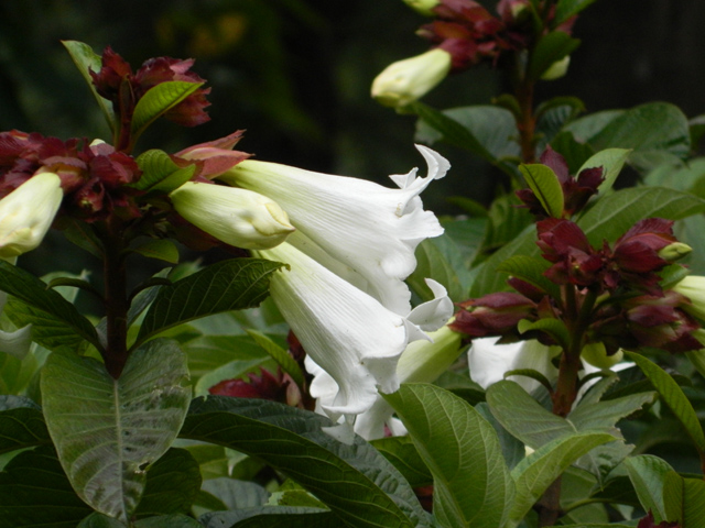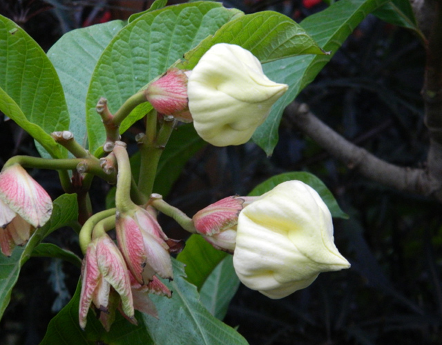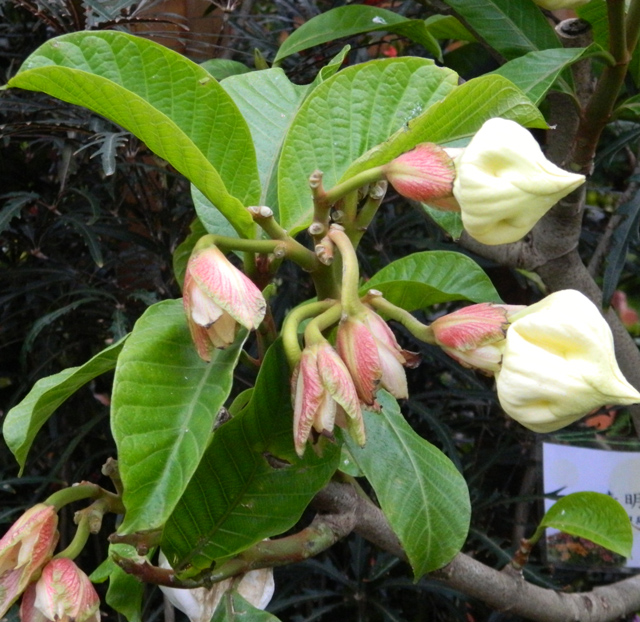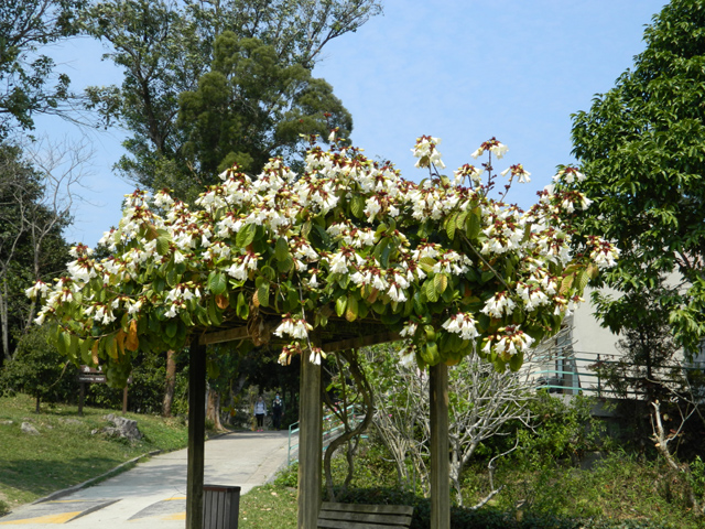 | 備註: 2014.3.8 花展攝 2014.3.14 CUHK攝 中國植物誌: 高大藤本;枝幼時有銹色柔毛,老時無毛、莖有皮孔。葉長圓狀倒卵形,長6-15厘米,寬3-8厘米,頂端短漸尖,幼時略被柔毛,老漸無毛,稀葉背被濃毛;側脈約15對;葉柄長2厘米。 聚繖花序頂生,著花3-5朵,有時更多;花梗有銹色柔毛,長2-4厘米;花萼裂片長圓狀披針形或倒卵形,或倒披針形,長2.5-4厘米;花冠長約10厘米,外面有微毛,裂片卵圓形;雄蕊著生於花冠筒的喉部,花藥箭頭狀。蓇葖形狀多變,內果皮亮黃色;種子長約2厘米;種毛白色絹質,長4厘米。花期春夏季,果期秋冬季。 FOC: Beaumontia spp. Lianas woody, robust, with latex. Leaves opposite, usually with petiolar glands. Inflorescences terminal or axillary cymes; bracteoles leafy, large. Flowers large, fragrant. Sepals free, bearing many basal glands inside; lobes leafy, large. Corolla white, funnelform, tube short or long, limb widely campanulate, throat not scaly, lobes overlapping to right. Stamens inserted at distal narrow portion of corolla tube; filaments arcuate, long, thickened distally; anthers sagittate, usually exserted, connivent, adherent to pistil head, cells spurred at base; disc ringlike, shallowly 5-lobed. Ovaries 2, connate, surrounded by disc; ovules numerous in each locule. Style long; pistil head fusiform. Follicles elongated, thick, hard. Seeds compressed, apex attenuate, coma silky; cotyledons leaflike or thick, radicle short. | |