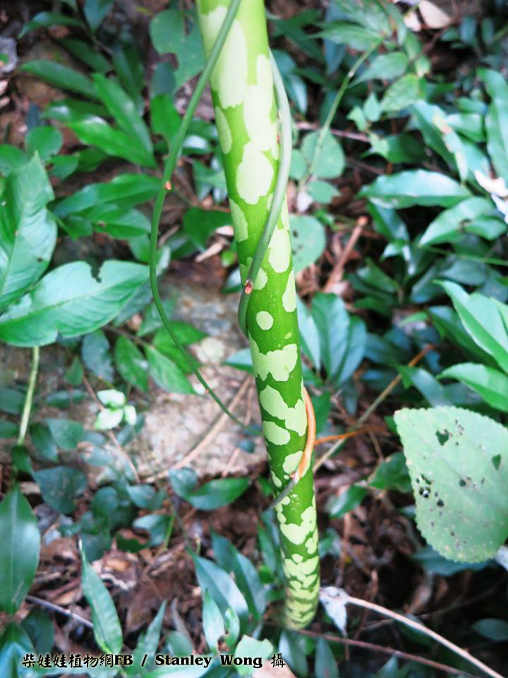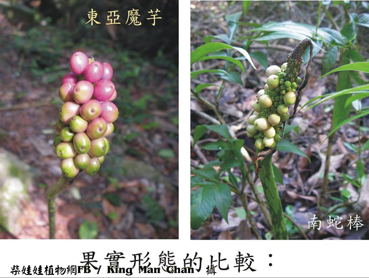 | 備註: 東亞魔芋與南蛇棒, 葉極似,難以辨認,不排除是東亞魔芋 remark: internal flag=1 2 photos <<香港有趣植物>>一書 南蛇棒--葉柄上有綠底白點的花紋 東亞魔芋--葉柄上是淺棕色底棕紅色斑紋 兩者分別好大,可以在沒花情況下,區分兩者. 東亞魔芋:肉穗花序明顯長於或等長於佛焰苞 南蛇棒:肉穗花序短於佛焰苞 兩者都是Amorphophallus 魔芋屬, 通常花, 葉不同時存在 ref: hk chklist book 南蛇棒A.dunnii 和 東亞魔芋 A. kiusianus 只有這兩隻有[迷彩]柄.. 根據hkwildlife.net 資料....南蛇棒很少能成功結果,而東亞魔芋卻總是果實累累。 | |