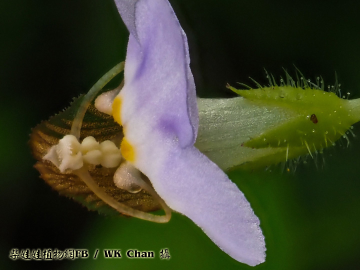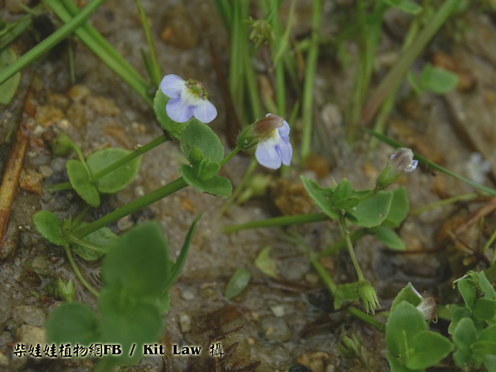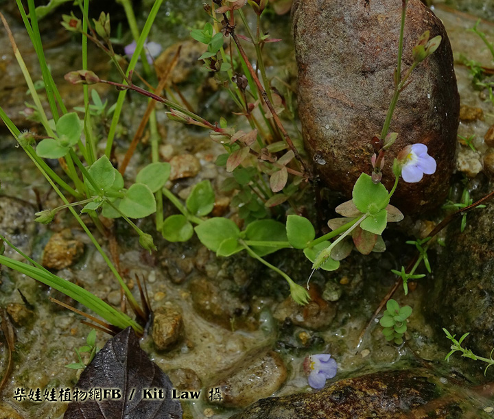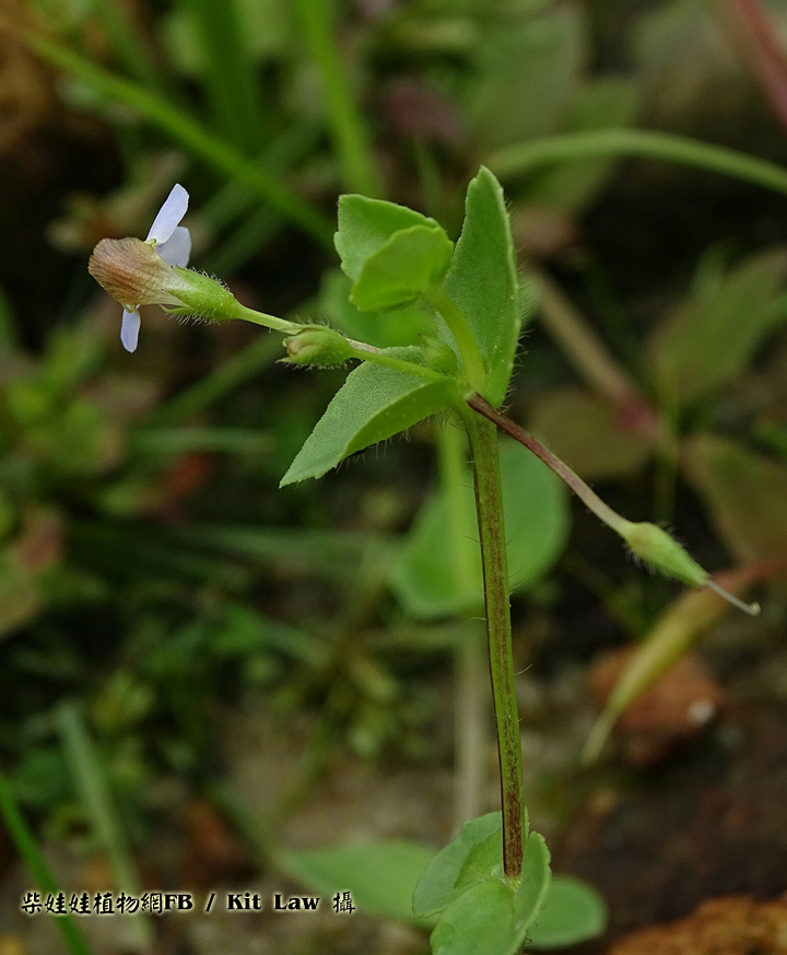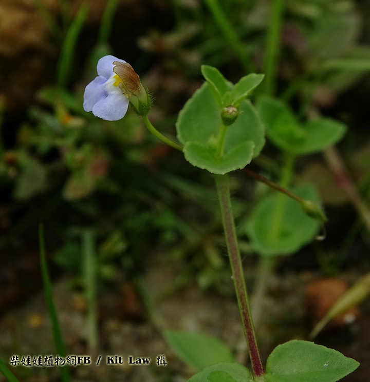 | 備註: 中國植物誌 一年生細弱草本,半直立,鋪散或有時長蔓,長6-30厘米以上,節間即可長達6厘米以上,莖枝有溝棱,近無毛或有伸展的疏毛而節上有較密的粗毛。葉下部者有短柄,上部者無柄,葉片卵形至心形,偶有圓形,長達12毫米,寬約相等或較狹,頂端急尖或鈍,基部楔形至近心形,邊緣有少數不明顯波狀細齒或幾全緣,常向背面反捲,上下兩面有稀疏壓平的粗毛,上面葉脈下陷,下面脈高出。 花對生葉腋,在莖枝的頂端作近繖形的短縮總狀花序,有花3-5朵,花梗細,長8-15毫米,有疏毛或近於無毛,無小苞片;萼僅基部聯合,齒5枚,狹披針形,外被粗毛;花冠紫色,長約9毫米;上唇直立,寬卵形,先端微缺,下唇甚長於上唇,長約5.5毫米,向前伸展;雄蕊4,全育,前方一對花絲細長,其基部膝狀彎曲;柱頭片狀。蒴果卵球形,與宿萼近等長;種子多數,矩圓形,有瘤突。花期5-9月,果期9-11月。 水生植物圖鑑一書 生境:濕生草地 花期5-9月 莖常匍匐生長,多分枝.莖明顯被毛,是最大特徵. 葉卵形至近心形,邊緣淺波狀,葉兩面明顯被毛 花單生於葉腋,下唇3裂瓣大小相等,花冠白色或帶淡紫色 蒴果近球形. | |