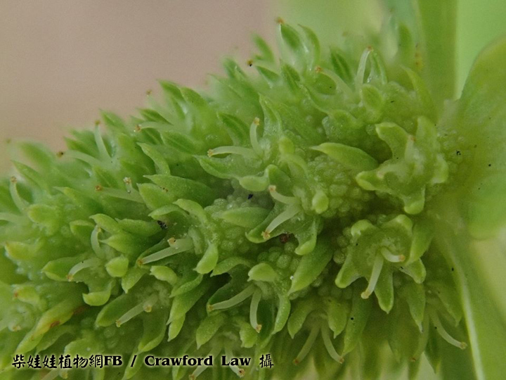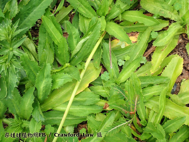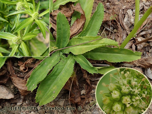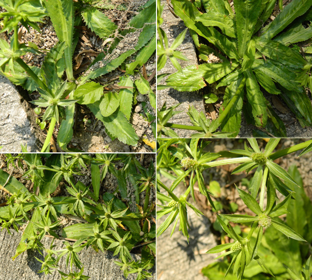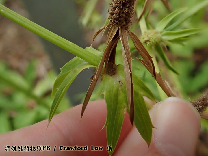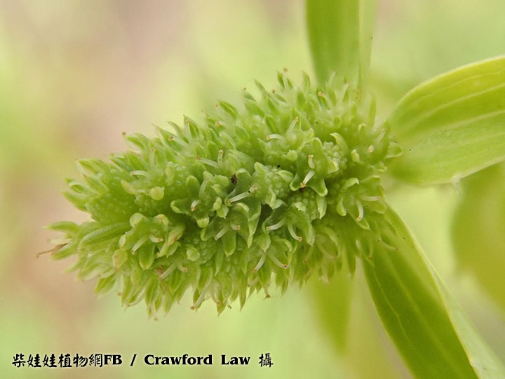 | 備註: 中國植物誌: 二年生或多年生草本,高11-40厘米或超過,主根紡錘形。莖綠色直立,粗壯,無毛,有數條槽紋,上部有3-5歧聚傘式的分枝。基生葉披針形或倒披針形不分裂,革質,長5-25厘米,寬1.2-4厘米,頂端鈍,基部漸窄有膜質葉鞘,邊緣有骨質尖銳鋸齒,近基部的鋸齒狹窄呈剛毛狀,表面深綠色,背面淡綠色,兩面無毛,羽狀網脈;葉柄短,基部有鞘可達3厘米;莖生葉著生在每一叉狀分枝的基部,對生,無柄,邊緣有深鋸齒,齒尖刺狀,頂端不分裂或3-5深裂。頭狀花序生於莖的分叉處及上部枝條的短枝上,呈圓柱形,長0.5-1.2厘米,寬3-5毫米,無花序梗;總苞片4-7,長1.5-3.5厘米,寬4-10毫米,葉狀,披針形,邊緣有1-3刺狀鋸齒;小總苞片闊線形至披針形,長1.5-1.8毫米,寬約0.6毫米,邊緣透明膜質;萼齒卵狀披針形至卵狀三角形,長0.5-1毫米,頂端尖銳;花瓣與萼齒近等長,倒披針形至倒卵形,頂端內折,白色、淡黃色或草綠色;花絲長約1.4毫米;花柱直立或稍向外傾斜,長約1.1毫米,略長過萼齒。果卵圓形或球形,長1.1-1.3毫米,寬1.2-1.3毫米,表面有瘤狀凸起,果棱不明顯。花果期4-12月。 | |