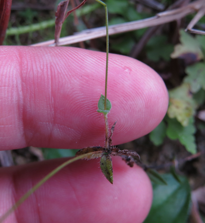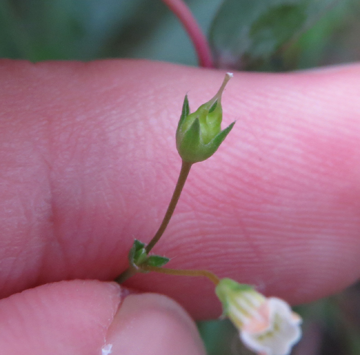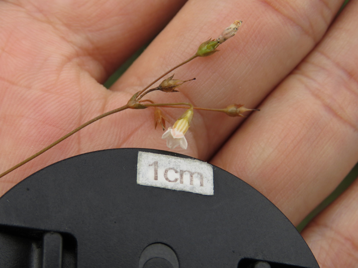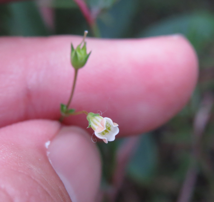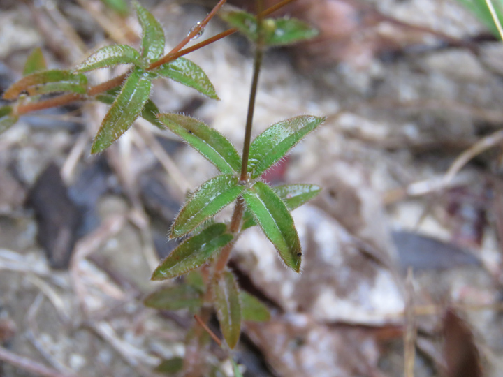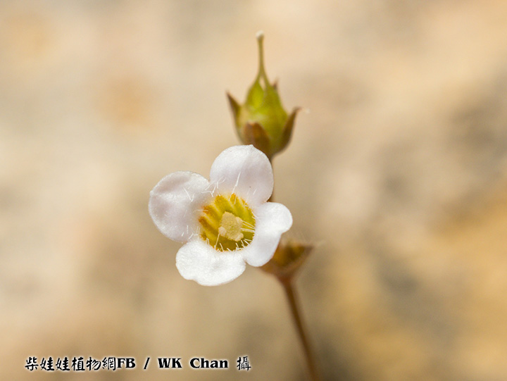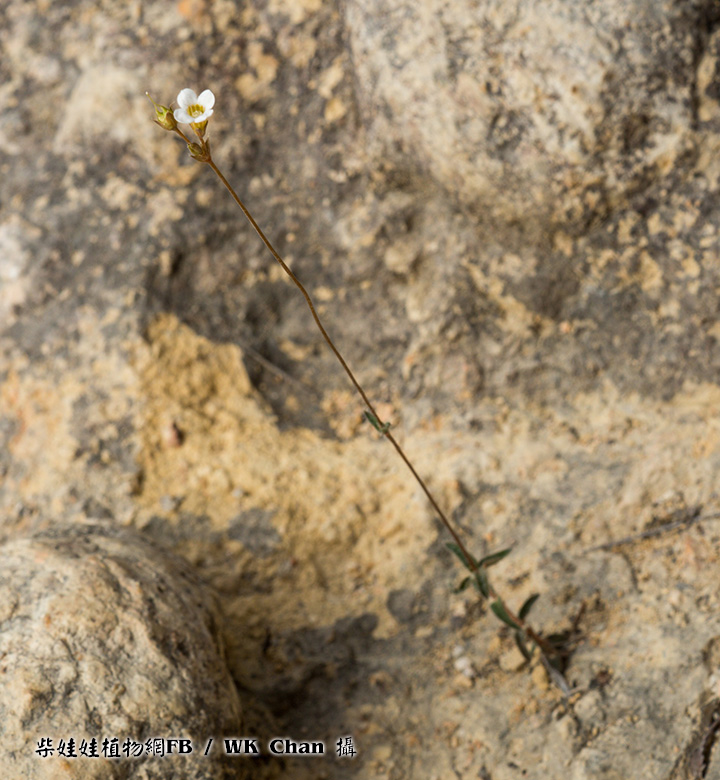 | 備註: 同姬苗好相似. 據FOHK, 姬苗 莖通常分枝,無毛或近無毛.花單生於莖上部的葉腋內. 至於 莖具明顯的四棱或四狹翅. 極細小植物 深圳植物誌: 一年生草本,高5-20(-30)cm。莖圓柱狀,直立,纖細,不分枝或從基部分枝,疏被短硬毛,後變無毛。葉在莖上部對生,疏離,在下部或基部4枚輪生;葉柄不明顯;葉片革質,卵形或長圓形,有時條狀披針形,長2-8mm,寬1-4mm,基部寬楔形至楔形,邊緣全緣,先端鈍或漸尖,除下面中脈及邊緣疏被白色長硬毛外,其餘無毛,側脈每邊約3條。聚繖花序繖形狀,頂生或近頂生,具2-6朵花,稀具單花;苞片卵形或卵狀披針形,長約2mm,邊緣被緣毛;花序梗纖細,長2-6mm,與花梗均被短硬毛或均無毛;花梗長5-9mm;花萼鐘狀,長1.5-2.8mm,裂片4,三角狀披針形,與萼筒近等長,外面疏被短硬毛,後變近無毛;花冠白色或淡黃色,鐘狀,長3-6mm,花冠筒喉部被疏被髯毛,裂片4,近圓形,長1-1.5mm;雄蕊內藏,花絲長1.5-3mm,花藥狹卵形或箭頭狀,先端急尖;雌蕊長約4.5mm,子房長約1mm,花柱絲狀,下部分離,1/4至1/3以上合生,柱頭先端2裂。蒴果近圓球狀,直徑約3mm,基部具宿存花萼,頂端有宿存花柱。種子小,狹橢圓體形,表面具小瘤狀凸起。花期:6-7月。果期:8-9月。 | |