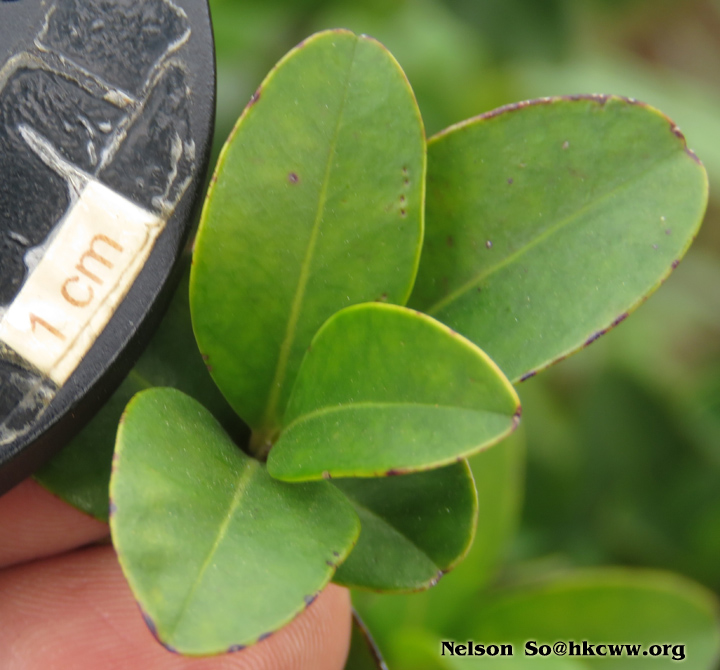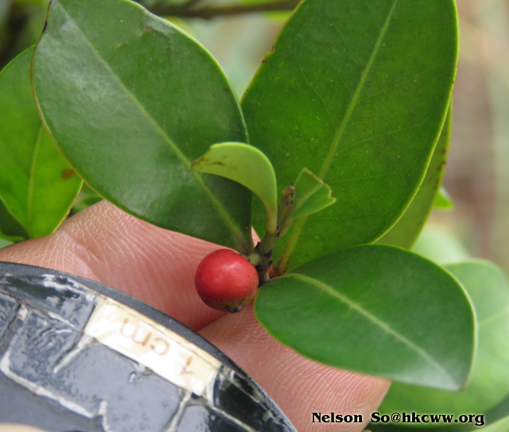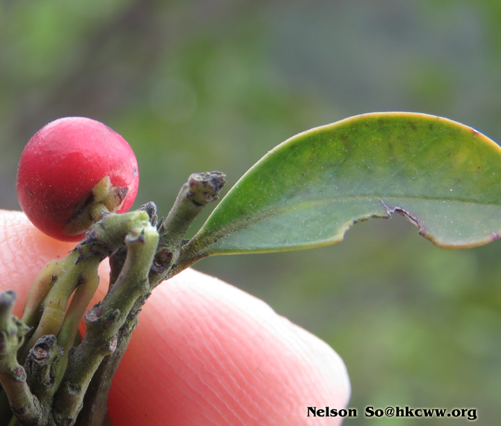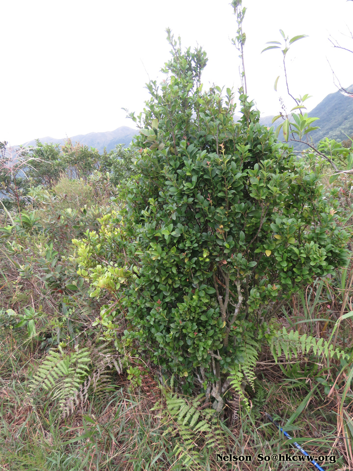 | 備註: 凹葉跟青茶果梗都粗短 常綠灌木或小喬木。小枝纖細,被微柔毛。 葉片厚革質,長2.5-3.5cm,寬1-2cm,先端短漸尖,鈍或圓形,有時微凹,基部鈍或楔形,全緣,葉面綠色,稍具光澤,除沿主脈被微柔毛外,餘無毛 雄花序由具2-3花的聚繖花序分枝簇生,總花梗長1-2毫mm,花梗長1-1.5mm thanks crawford's info 山頂開揚位置. 花攝於4月,果攝於11月 同屬其中一個近似品種 是Ilex lohfauensis(羅浮冬青/矮冬青)。I. lohfauensis 小枝密被毛而肉眼易見。葉亦較小塊,葉面中脈明顯隆起。 thanks Crawford Law's info FOHK: 羅浮冬青同青茶冬青好相似: Notes: In its thin leathery leaves, paucifasciculate inflorescences, paired and shortly pedicellate fruits and striate-esulate pyrenes, Ilex lohfauensis[羅浮冬青/矮冬青] is very closely related to I. hanceana[青茶冬青], but the latter [後者:青茶冬青] has puberulous被微柔毛 branchlets and elliptic or obovate leaves with short-acuminate or obtuse or rarely rounded and retuse[微凹] apices, and plane or slightly impressed midveins. 羅浮冬青葉薄革質,花序簇生,果成對並具短果梗,及分核具紋缺糟,與青茶冬青(I.hanceana)甚相近,但後者小枝有毛, 葉橢圓形或倒卵形,先端短漸尖或鈍,稀圓或微凹,及具平整或稍下凹的中脈.source from 冬青與我一書 中國植物誌: 常綠灌木或小喬木,高2-10米;小枝纖細,被微柔毛,栗褐色,較老枝具隆起的新月形葉痕,無皮孔,當年生幼枝具縱棱及槽;頂芽圓錐形,被微柔毛。葉生於1-3年生枝上,葉片厚革質,倒卵形或倒卵狀長圓形,長2.5-3.5厘米,寬1-2厘米,先端短漸尖,鈍或圓形,有時微凹,基部鈍或楔形,全緣,葉面綠色,稍具光澤,除沿主脈被微柔毛外,餘無毛,背面淡綠色,無毛,主脈在葉面平坦或微凹,背面隆起,側脈7-8對,兩面不明顯或稍明顯,網狀脈兩面不明顯;葉柄長2-5毫米,被微柔毛,上面具淺縱槽或平坦;托葉三角形,急尖,宿存。 花序簇生於二年生枝的葉腋內,被微柔毛,苞片三角形,被微柔毛。雄花序由具2-3花的聚繖花序分枝簇生,總花梗長1-2毫米,花梗長1-1.5毫米,具基生小苞片1或2枚;花4基數,白色;花萼盤狀,直徑約2毫米,被短柔毛,4淺裂,裂片圓形,具緣毛;花冠輻狀,直徑約3毫米,花瓣卵形,基部稍合生;雄蕊長不及花瓣;退化子房圓錐形,中央凹人。雌花序由單花簇生,花梗長約1.5毫米,被微柔毛,基生披針形小苞片2枚;花萼與花冠同雄花;退化雄蕊長為花瓣的3/4,敗育花藥心形;子房近圓卵形,直徑約1.3毫米,柱頭寬盤狀。果球形,直徑約5毫米,成熟後紅色,果梗長約2.5毫米,被毛;宿存花萼平展,四角形,4裂,裂片三角形,具緣毛;宿存柱頭薄盤狀,4或5淺裂;分核4,闊橢圓形或卵狀橢圓形,長約4毫米,寬約3毫米,背部具隆起的分枝縱條紋,側面平滑,內果皮革質。花期5-6月,果期7-12月。 模式標本採自香港。 | |