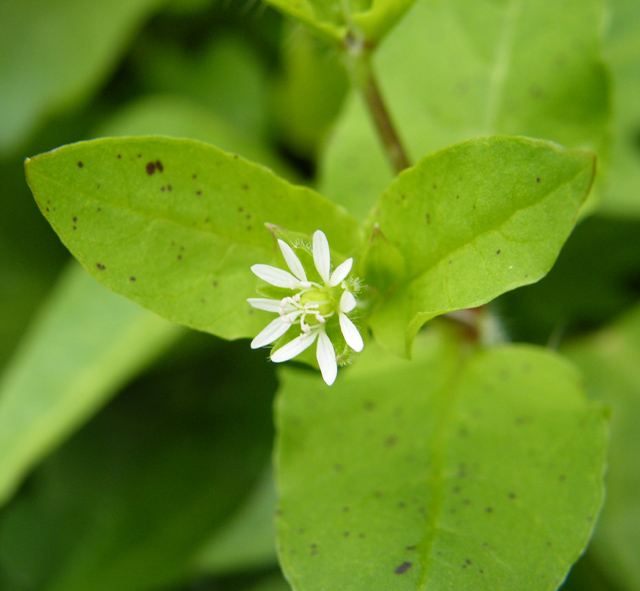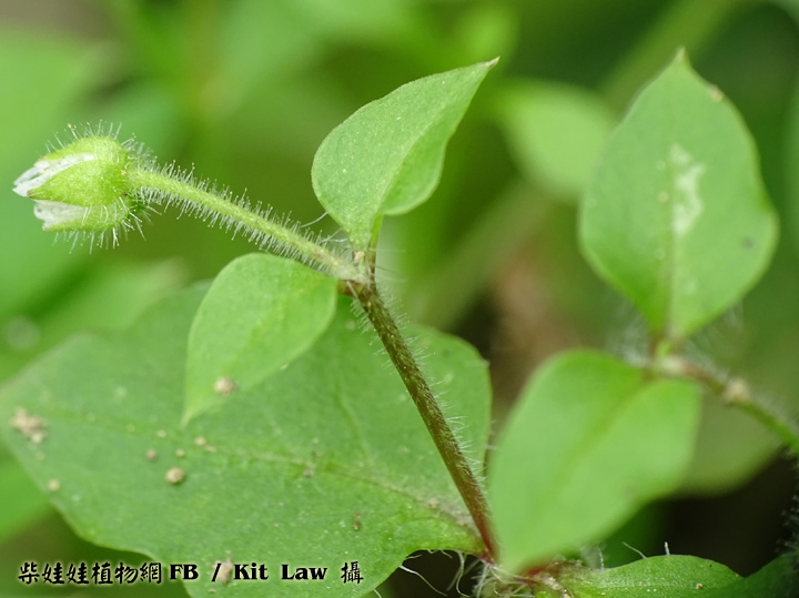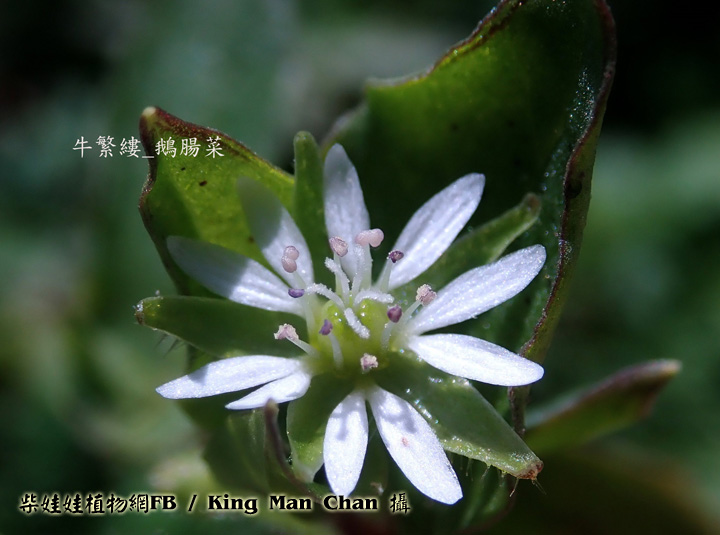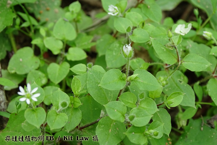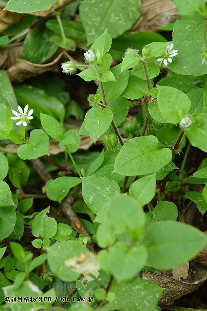 | 備註: GBIF: Myosoton aquaticum is syn of Stellaria aquatica 深圳植物誌: 花柱3,稀2或4 -- 繁縷屬 Stellaria sp. (eg.繁縷/魚腸草, 雀舌草) 花柱5 -- 鵝腸菜屬 Myosoton sp. (eg.牛繁縷/鵝腸菜) hkchklist book: 葉披針形至長圓狀披針形,無柄或具短柄--雀舌草 葉卵狀心形,具明顯葉柄--繁縷/魚腸草 牛繁縷_鵝腸菜 Myosoton aquaticum -- 雄蕊10 繁縷_魚腸草 Stellaria media -- 雄蕊3-5 深圳植物誌: 二年生或多年生草本。主根圓柱形,長達14 cm,粗1—1.5 mm,具多數須狀側根。莖上升,高10—40 cm,或披散狀,長50—80 cm,上部被腺毛。 葉柄長0.5—1.5 cm,上部葉常無柄或具短柄,疏生柔毛。葉片卵形或寬卵形,長1.0—5.5 cm,寬0.6—3 cm,基部稍心形,多少下延,先端急尖,兩面無毛,中脈隆起,側脈不明顯,有時邊緣具毛; 花單生於葉腋或組成頂生二歧聚繖花序;苞片葉狀,邊緣具腺毛;花梗纖細,長1—2 cm,花後伸長並向下彎,密被腺毛;萼片卵狀披針形或長卵形,長4—5 mm,果期長達7 mm,頂端較鈍,邊緣狹膜質,外面被腺柔毛,脈紋不明顯;花瓣白色,2裂,裂片條形或披針狀條形,長3—3.5 mm,寬約1 mm;雄蕊10,短於花瓣,花絲絲狀,基部漸加寬,花藥小,卵形;子房長圓柱形,花柱短,線形,彎曲。蒴果卵球形,長0.5—0.7 cm,齒裂外彎。種子腎形,直徑約1 mm,稍扁,暗褐色,具小疣狀突起。花果期幾全年。 | |
