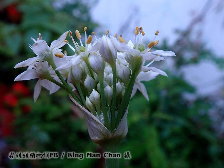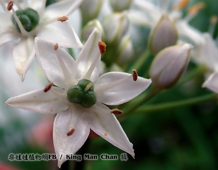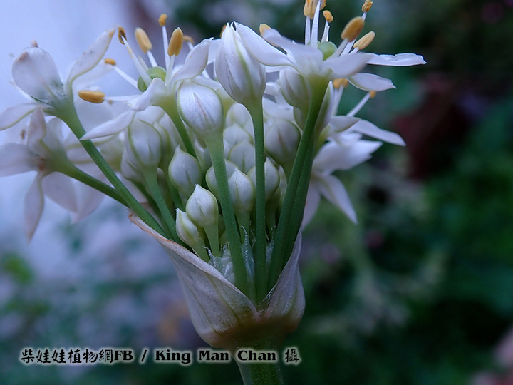 | 備註: 深圳植物誌: 多年生草本。植株高30-45cm,具橫生的根狀莖。鱗莖簇生,圓柱形,外皮暗黃色或黃褐色,破裂後呈網狀或近網狀。葉無柄;葉片條形,扁平,實心,比花葶短,寬1. 5-8mm,兩面深綠色,平滑,柔軟。 花葶長圓柱形,實心,直立,高25-60cm,常具2縱棱,基部被葉鞘覆蓋;總苞單側開裂或2-3裂,宿存;聚傘繖形花序半球形或近球形,具20-40朵疏生的花;花梗近等長,比花被片長2倍,數枚花梗的基部有1枚共同的苞片;每一花梗的基部又具1枚小苞片;花被白色,花被片常具綠色或黃綠色的中脈,外輪花被片長圓狀卵形至長圓狀披針形,長4-8mm,寬1. 8-3mm,先端具短尖,內輪花被片長圓狀倒卵形,稀長圓狀卵形,長4-8mm,寬2. 1-3. 5mm,先端具短尖或鈍;花絲狹三角形,近等長,長為花被片長度的2/3-4/5,基部合生並與花被片貼生,內輪花絲的基部較外輪的寬;子房倒圓錐狀球形,具小疣狀突起,腹縫線基部無蜜腺。種子黑色,具棱。花期:花、果期:5-10月。 用途:幼苗和花葶作蔬菜供食用。割去地上部分,將根埋於土中避光生長,則生出黃色的嫩葉,稱韭黃,為優質蔬菜,供食用。種子可藥用,有補肝腎、暖腰膝、興奮、壯身、健胃的功效;可治瀉痢、多尿、遺精和疝氣等症。 | |