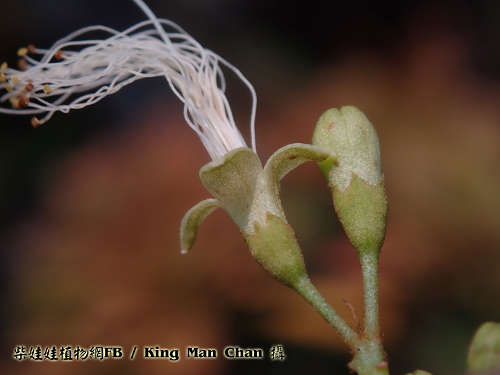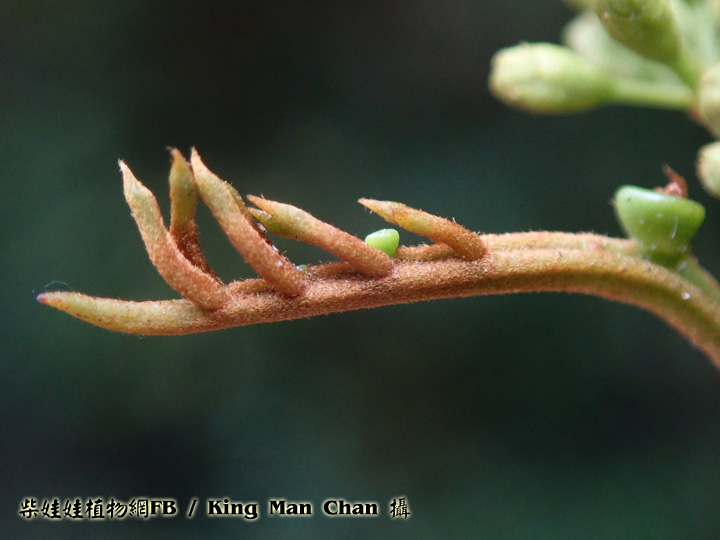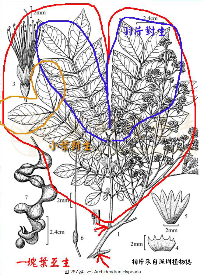 | 備註: 香港猴耳環屬有三只 1a.小葉互生 => 亮葉猴耳環 1b.小葉對生 ==>2a.小枝圓柱形,不具棱, 羽片2-3對, 小葉4-7對 => 薄葉猴耳環 ==>2b.小枝無刺,有明顯的棱角, 羽片3-8對, 小葉3-12(-16)對 => 猴耳環 thanks Young Chandd's analysis. hk chklist book is error. Correct one refers to FoHK and 中國植物誌 深圳植物誌: 常綠喬木,高8-10米。小枝4-6棱柱形,密被黃褐色短柔毛。二回羽狀複葉有羽片3-8對;葉柄長2-8cm,與葉軸均有棱並密被黃褐色短柔毛,在葉柄近基部和每一對羽片著生處的葉軸上以及上部2-7對小葉著生處稍下的羽片軸上均有1枚腺體;最下部的1對羽片有小葉2-4對,向上的漸多,頂端的1對羽片的小葉多至10-14對;小葉對生,小葉柄長約1毫米;小葉片斜長方形,長1 -7cm,寬0.5-3cm,由上向下漸變小,近革質,兩面無毛,上面光亮,基部截形,兩側極不相等,先端急尖,兩側亦不相等。頭狀花序連花絲直徑約1.5厘米,有花6-10數朵,多數頭狀花序再排成大型的頂生和腋生的圓錐花序,長可達30厘米;花序梗,花序軸和花梗均密被褐色短柔毛;花梗長2-3mm的;花萼鐘狀,長約2.5毫米,與花冠外面均密被短茸毛,先端具5齒裂;花冠白色,鐘狀,長4-5mm的,管部長為花冠全長的2 / 3,片披針形;雄蕊多數,長約1.5厘米,白色,基部合生成管狀;子房有柄,密被短茸毛,花柱略長於雄蕊,柱頭小莢果成熟時暗褐色,旋卷成環狀或彎卷,寬約1.5厘米,種子間縊縮,除兩側縫線密被短柔毛外,其餘無毛種子橢圓形,黑色花期:。3- 5月果期:6- 11月。 | |