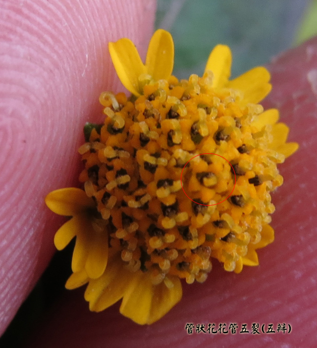 天文草: 管狀花花管五裂(五瓣), 花序壓扁的卵狀