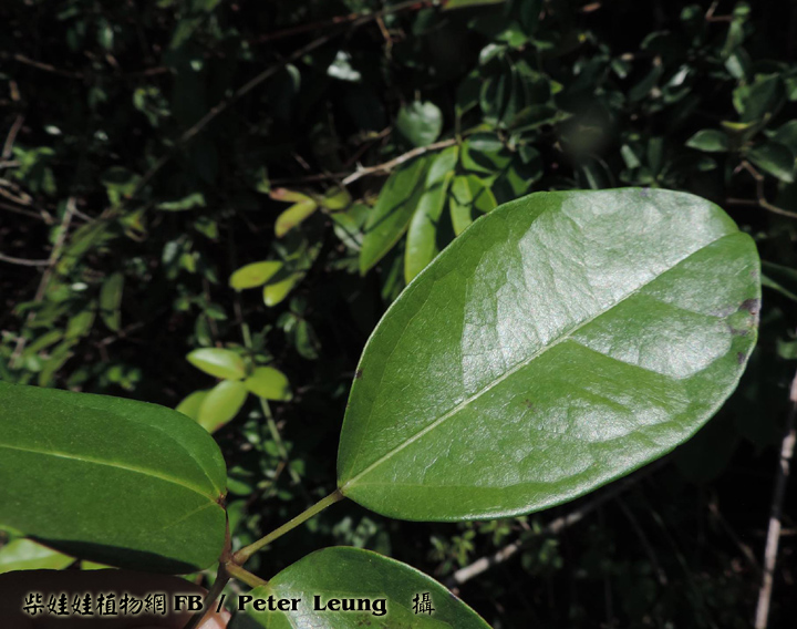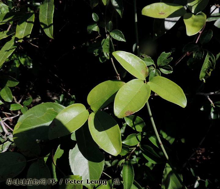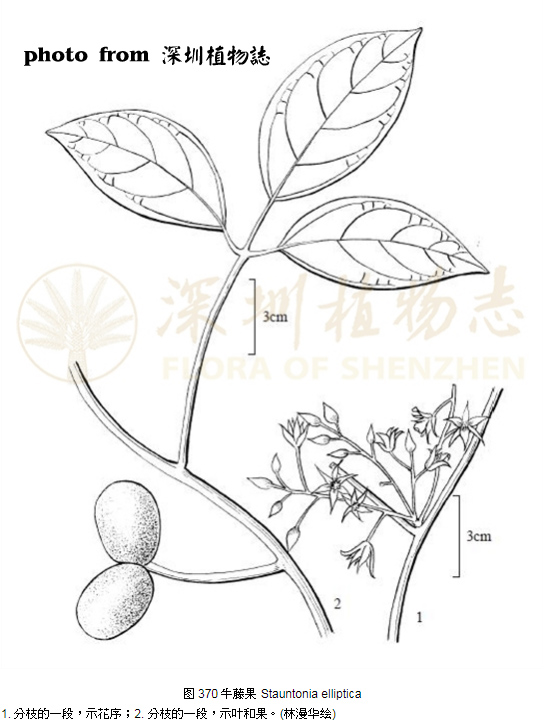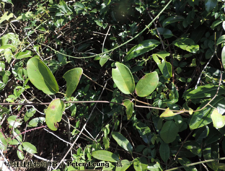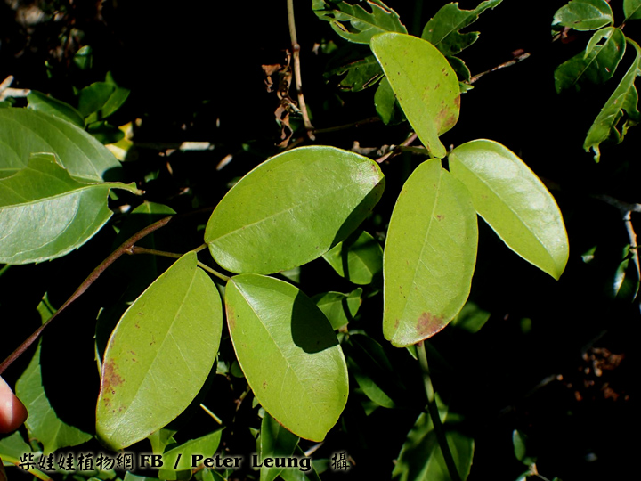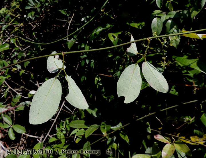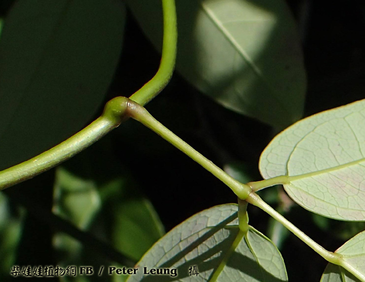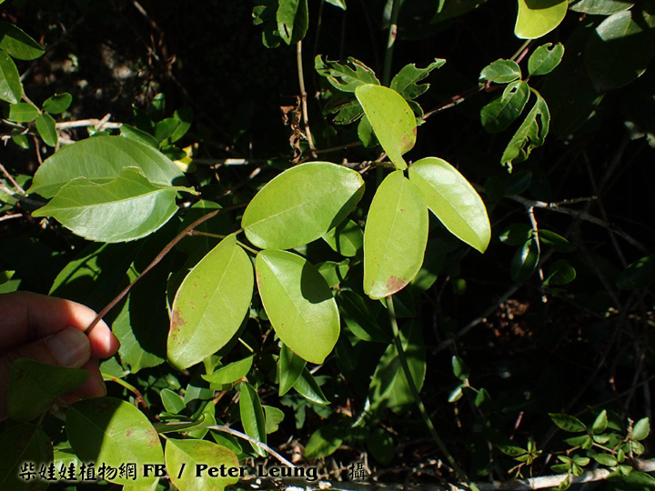| 備註: 有時一年開兩次,一次在七八月,另一次在十二月一月(thanks Edward Mar's info) 深圳植物誌: 木質藤本。全株無毛。莖和枝圓柱形。冬芽鱗片不明顯。掌狀複葉有3小葉;葉柄纖細,長2.5—17cm;小葉柄長1—2cm,小葉葉片橢圓形、長圓形、卵狀長圓形或倒卵形,長3—11cm,寬2—6cm,紙質或近革質,基部鈍或圓,先端鈍或急尖,下面灰綠色至淡灰綠色,上面深綠色,中脈下面凸起,上面凹入,側脈每邊4—5條,斜升至邊緣前彎拱網結。 傘房狀總狀花序數個簇生於葉腋,長4—6cm,著花多朵;花序梗纖細,基部具多枚宿存、長不及1mm的寬卵形的苞片;小苞片鑽形,長不及1mm;花雌雄同株,同序或異序,灰綠色至淡白色;雄花:花梗長1—1.2cm;外輪3枚萼片卵形,長約8mm,先端急尖,內輪3枚萼片披針形;蜜腺狀花瓣卵狀披針形,短於花絲;花絲合生至近頂部呈管狀,藥隔頂端的角狀附屬物與花藥等長;退化雌蕊鑽形,藏於花絲管內;雌花:花梗長1.8—2cm;外輪3枚萼片狹披針形,長約1.5cm,寬3—4mm,內輪3枚萼片條狀披針形,長約1.4cm,寬約2mm;蜜腺狀花瓣披針形,長約1mm;退化雄蕊長約1mm;心皮卵球形,無花柱,柱頭錐形。果長圓體形至近球形,長4—5cm,直徑2—4cm,灰褐色,乾後淡灰褐色。種子近三角形,略扁,種皮淡黑色,有光澤。花期:5—8月;果期:7—12月。 FoHK Woody twining shrub, glabrous throughout. Leaves trifoliate; petioles 10 –17 cm; leaflets elliptic, oblong to ovate-oblong or obovate, 3 –11 × 2–5 cm, base rounded, apex acute or obtuse, margin entire and slightly revolute, dark green adaxially, pale green abaxially; lateral nerves and veins raised on abaxial surface; petiolules 1–3 cm. Racemes[總狀花序] several and fascicled in axils of leaves, with many pendent pale green to whitish flowers. Male flowers: pedicels 10 –12 mm; outer sepals ovate-elliptic, inner sepals lanceolate, 6–9 × 2–3 mm; nectariform petals ovate, 1–1.5 mm; stamens ca. 5 mm, connective apical appendages as long as anther. Female flowers: pedicels 18 –20 mm; sepals narrowly to linear lanceolate, 14 –15 × 2– 4 mm; staminodes ca. 1 mm; carpels 3, free, oblong, with elongated and pointed stigmas. Fruit ovoid or oblong, 4 –5 × 2– 4 cm. | |