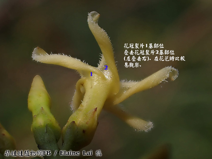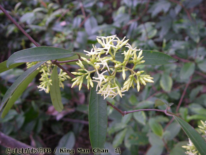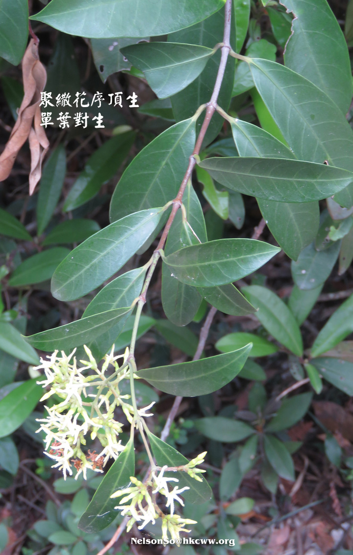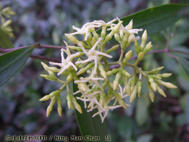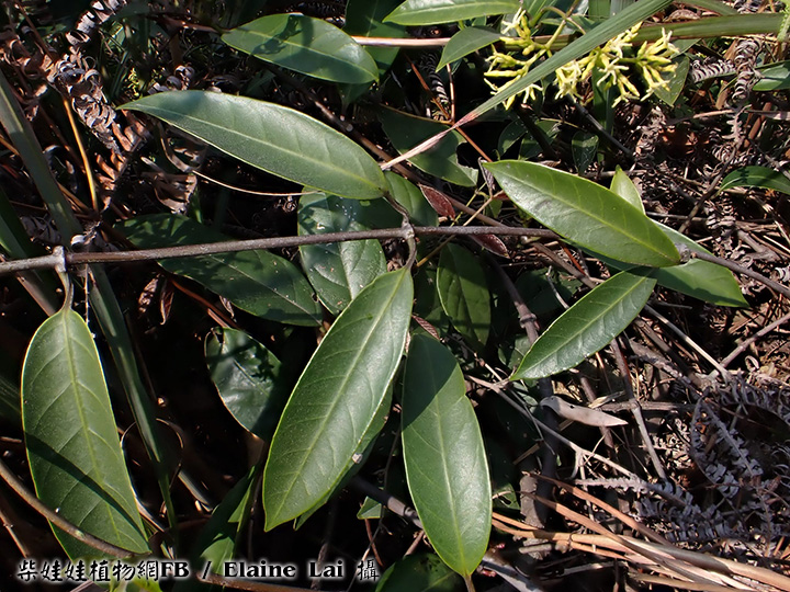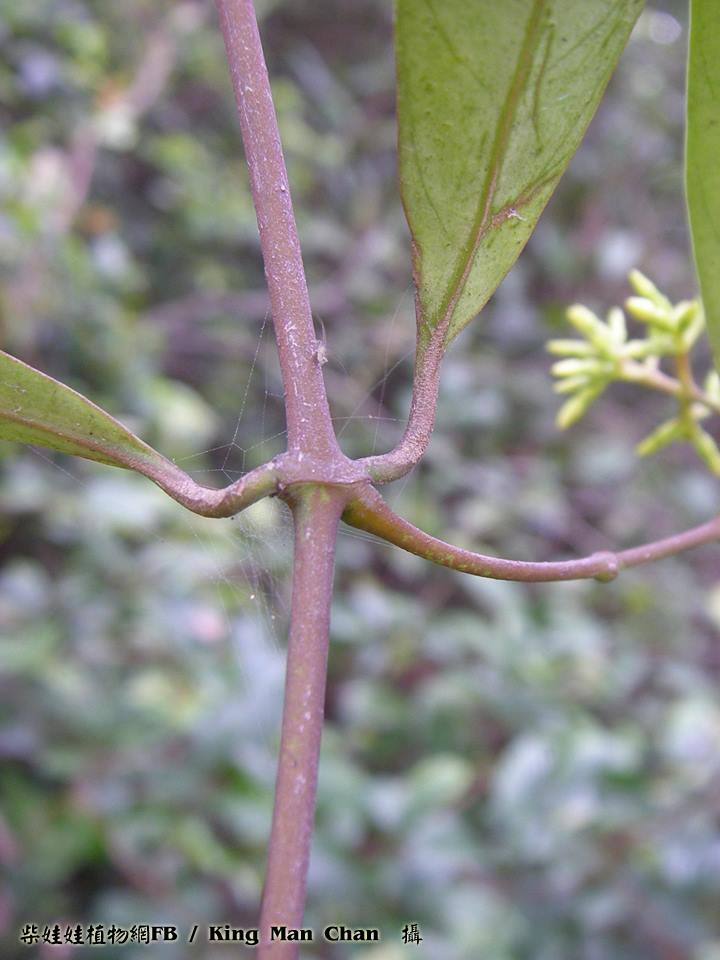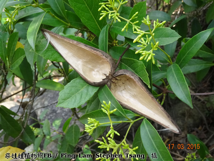 | 備註: 果好似羊角坳 香港原生木質藤本,生於疏林;全株有乳汁,單葉對生,有葉柄;聚繖花序頂生,花冠青黃色或白色,花冠裂片向後扭捲,花期 3 - 5月;蓇葖果成雙而生。source from 南國群芳譜 深圳植物誌: 木質藤本,長達10m,除花冠外全株無毛。枝條黑灰色。葉柄長0.5-2cm;葉片窄長圓形或窄卵圓形,長4-15cm,寬1.2-5cm,基部楔形,先端漸尖,側脈每邊有6-12條,乾時兩面橫皺。聚傘圓錐花序頂生或腋生,長5-10cm,寬3-12cm,具多數花;花序梗長1-14cm;苞片卵形,長2-3mm;花梗長1.5-2mm;小苞片2,與苞片同形,但較小,長1-1.5mm,生於花萼基部;花萼裂片卵形,長2-3mm;花冠白色或淡黃白色,花冠筒長4-5mm,內面疏被柔毛,喉部微收縮,裂片窄條形,微呈鐮刀狀,長約5mm,寬約1.5mm,上面疏被短柔毛;雄蕊著生在花冠筒基部;花盤杯狀,先部5淺裂或全緣,緊貼在子房周圍;子房無毛,花柱短,柱頭圓錐狀,先端2裂。蓇葖果雙生,極叉開,下部膨大呈卵球狀,向先端漸狹,長8-10cm,最寬處直徑2.5-3cm。種子棕黑色,具長喙,喙長2cm,寬6mm,喙先端具長約6cm的種毛。花期:4-11月。果期:6-12月。 FOC: Lianas to 10 m, glabrous[全株無毛] except for corolla[除了花冠]. Branches pale gray. Petiole 0.5-2 cm[柄長0.5-2CM]; leaf blade deep green adaxially, lighter abaxially, narrowly oblong to narrowly ovate, 3-14 X 1.2-5 cm, papery or somewhat leathery; lateral veins 6-12 pairs[側脈6-12對], usually wrinkled in dry state. Cymes paniculate, terminal or axillary, 3-26 X 3-13 cm, long pedunculate. Sepals ovate, 2-3 mm. Corolla white or yellowish green, pilose inside, tube 3-4.5 mm; lobes falcate, narrowly oblong, as long as or shorter than tube. Stamens inserted at base of corolla tube; disc cup-shaped, shallowly 5-lobed or entire, attached to ovaries. Follicles narrowly ellipsoid, dilated at base, 8-13 X 1.6-3 cm. Seeds tawny, beaked, ca. 2 cm x 6 mm, coma ca. 6 cm. Fl. Apr-Nov. | |