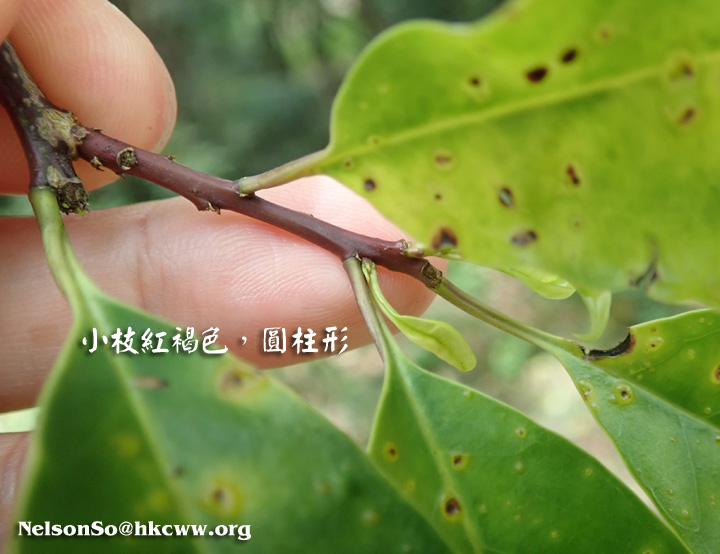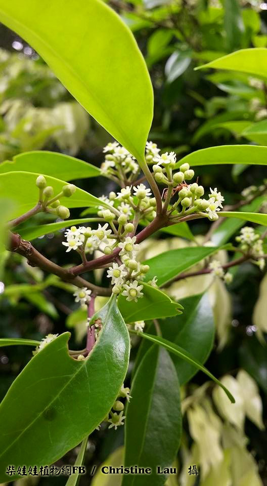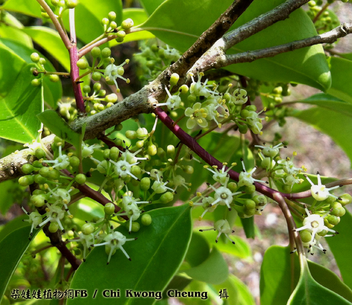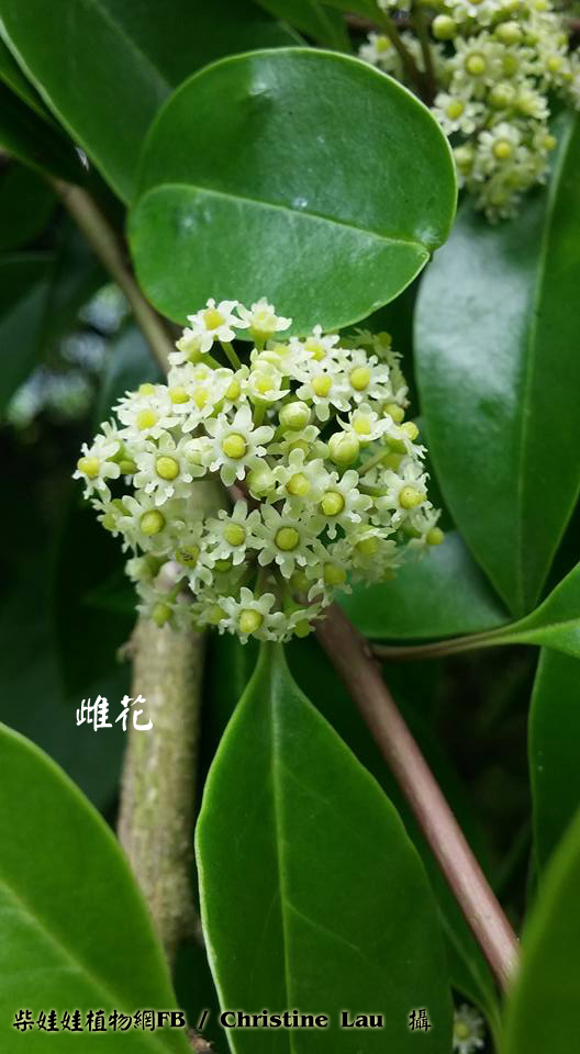 | 備註: 娃娃手記: 1.小枝紅褐色,圓柱形 2.樹皮灰色至灰黑色 深圳植物誌: 常綠灌木或喬木,高4-15m。樹皮灰色至灰黑色;小枝紅褐色,圓柱形,當年生枝具縱棱,無毛,無皮孔。葉僅見於當年生枝上;托葉鑽狀條形,長1-1.5mm,早落;葉柄長1-2cm,多少被微柔毛,頂端具葉片基部下延而成的狹翅;葉片薄革質或紙質,卵形、倒卵形或橢圓形,長4-8cm,寬1.7-3.5cm,基部楔形或鈍,邊緣全緣,先端短漸尖,兩面無毛,側脈6-9對。 簡單二歧或複二歧聚繖花序或繖形花序,單生於當年生枝的葉腋,具2-8朵花; 雄花序:花序梗長0.3-1cm,無毛;花梗長3-5mm,無毛或被微柔毛,基部具1-2枚卵狀三角形的小苞片;花白色,4基數;花萼盤狀,直徑約2mm,被微柔毛,裂片4,三角形;花冠輻狀,直徑約5mm,花瓣長圓形,長約2.5mm,開放後反折;雄蕊長於花瓣,花藥卵狀橢圓形,縱裂;退化子房墊狀; 雌花序:花序梗長約5-12mm,無毛;花白色,5基數,稀7基數;花萼淺杯狀,直徑約2mm,無毛,裂片5,三角形,邊緣囓蝕狀;花冠輻狀,直徑約4mm,花瓣倒卵狀長圓形,長約2mm,基部稍合生;退化雄蕊長為花瓣的1/2,敗育花藥卵形;子房卵形,長約1.5mm,柱頭頭狀。果近球形或稀橢圓體形,直徑約5mm,成熟時紅色,宿存花萼平展,宿存柱頭厚盤狀,凸起,5-6淺裂;分核5-7,橢圓體形,長約5mm,背面具3縱棱及2溝,稀具2棱及單溝。花期:4-5月。果期:8-12月。 red seed: 2014.10.26 樹皮淡灰色;小枝光滑無毛. 葉柄長1-2CM.葉薄革質或紙質,橢圓形,卵形或倒卵形,長4-9CM,寬1.8-4CM,全緣. 花白色,雌雄異株,通常4-6朵花排成聚傘花序,著生於腋處,雄花4數,雌花5-7數. 樹皮及葉具藥用價值. source from 冬青與我一書 嫩枝棗/紅色,兼光滑令身〔有些有班點〕,新葉葉柄也很嫩青色,有凹坑。(thanks Igu Ana Lee's info) | |