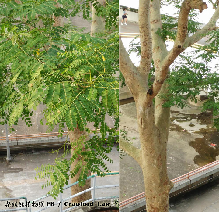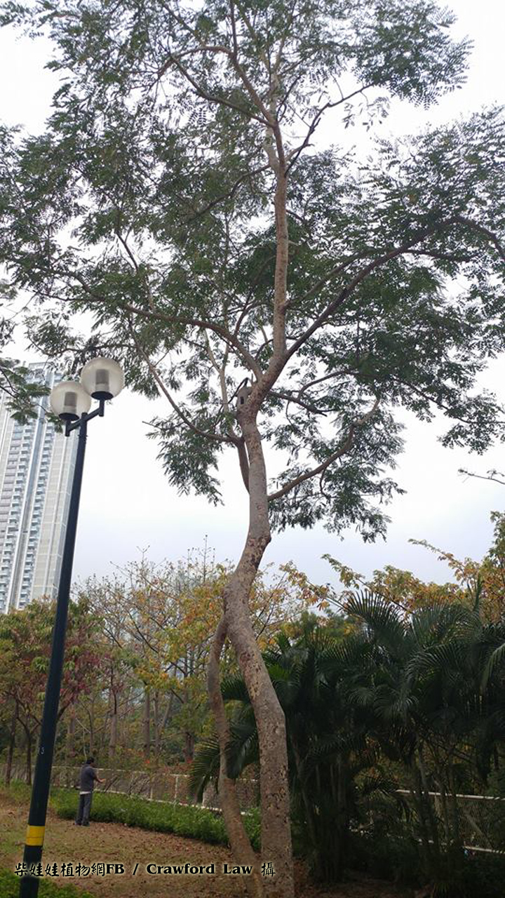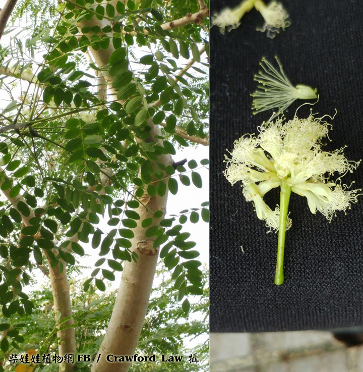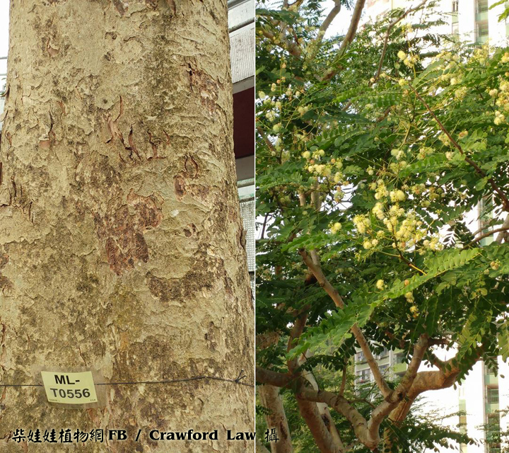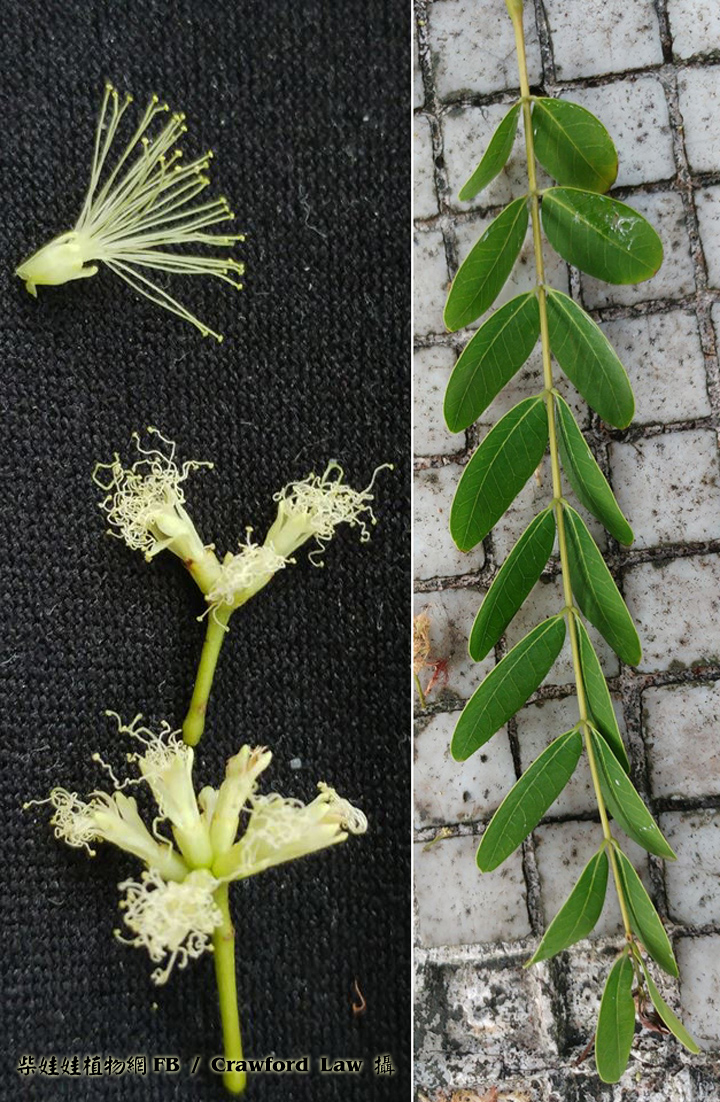 | 備註: Crawford Law's info: 高大落葉喬木,廣泛分佈於台灣、南中國、南亞、東南亞 跟 大洋洲 各地。 樹皮平滑,呈灰綠、黃綠 至 黃褐色,或呈 薄片狀 剝落。 葉互生,二回偶數羽狀複葉,總葉柄近基部有1枚橢圓形腺体。(合歡屬常在葉柄或者葉軸上有腺體) 羽片3-5對。每枚羽片有小葉6-12對,對生。 小葉呈橢圓形,兩邊不對稱,中脈為於中間偏下方,基部偏斜,先端圓鈍或微凹。 頭狀花序排成圓錐花序,頂生或腋生。花萼漏斗狀,冇毛。花冠綠白至黃白色。兩性花,雄蕊長0.8-1.2cm。 熱帶地區全年開花結果,於香港花期約夏末秋初。 莢果紅褐色,帶形,長10-15cm,寬1.5-2.5cm,扁平,冇毛。 FOC: Trees, deciduous, to 15 m tall. Branchlets slightly pubescent or subglabrous. Leaf petiole with an oblong gland ca. 1 cm above base; pinnae 3-5 pairs, 15-20 cm; petiolules小葉柄 ca. 2 mm; leaflets 6-12 pairs, ovate to subrhombic, 3-4.5 × 1.2-2.2 cm, subleathery, sparsely appressed pubescent, main vein closer to lower side, base oblique, apex obtuse or emarginate. Heads ca. 20-flowered, arranged in axillary or terminal panicles. Flowers uniform, sessile. Calyx 2-3 mm, glabrous. Corolla yellow-white, ca. 6 mm; lobes lanceolate, ca. 2.5 mm, apex pubescent. Staminal tube longer than corolla tube. Ovary glabrous, subsessile. Legume ligulate, flat, 10-15 × 1.5-2.5 cm, glabrous. Seeds 8-12, obovoid-elliptic; pleurogram obovate-elliptic. Fl. May-Sep, fr. Sep-Feb of following year. | |