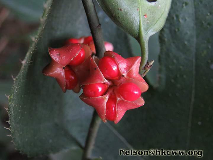 | 備註: GBIF: Euonymus longifolius is syn of Euonymus tsoi 香港島山頂攝 果相攝於20160730, 野外. 同FoHK 花相攝於20170530 紅果攝於20180120 Revision of five species of Euonymus (Celastraceae) from East and South Asia | |