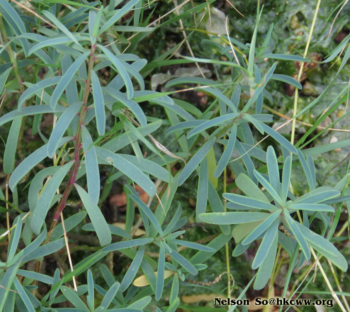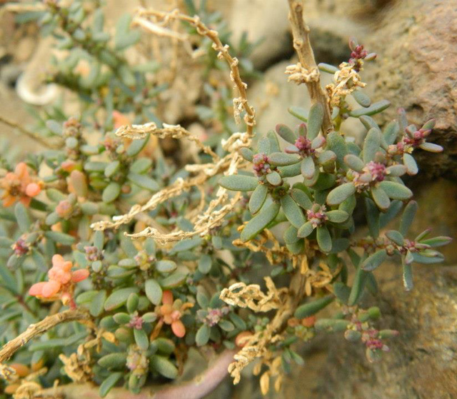 | 備註: 中國植物誌: 小灌木,高20-50厘米。莖多分枝,下部長生有不定根,灰褐色至淡黃色,通常有明顯的殘留葉痕。葉條形,半圓柱狀,長1-2.5厘米,寬2-3毫米,粉綠色或帶紫紅色,先端急尖或鈍,基部漸狹,具關節,勁直或微彎,通常斜伸,枝上部的葉(苞)較短,狹卵形至橢圓形,上面平,下面凸。團繖花序含1-5花,腋生;花兩性;花被頂基略扁,稍肉質,綠色或帶紫紅色,5深裂,裂片卵狀矩圓形,無脈,邊緣近膜質,果時增厚,不具附屬物;花藥寬卵形,長約0.5毫米;柱頭2,近錐形,不外彎,黃褐色至黑褐色,有乳頭突起,花柱不明顯。胞果扁,圓形,果皮膜質,易與種子分離。種子雙凸鏡狀,直徑約1毫米,黑褐色,有光澤,表面有微點紋。花果期7-11月。 | |